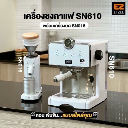 เซ็ตเครื่องชงกาแฟสไตล์มินิมอล ETZEL รุ่น SN610 + เครื่องบด SN016 Single Dose สีขาว เฟืองไทเทเนียม